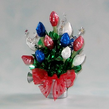 Made with a ten chocolate kiss rosebud stems (two chocolate kisses per stem) in a mini watering can. This design makes a perfect party decoration for a 4th of July picnic.   Other colors also available.